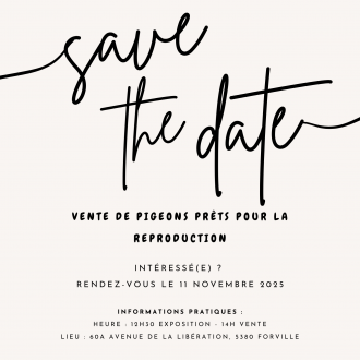 Le 11 Novembre 2025, une vente de pigeons prêts pour la reproduction aura lieu au local de la société, au 60A, Avenue de la Libération, 5380 Forville.